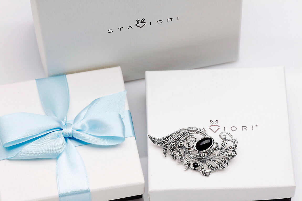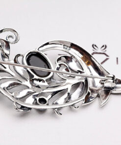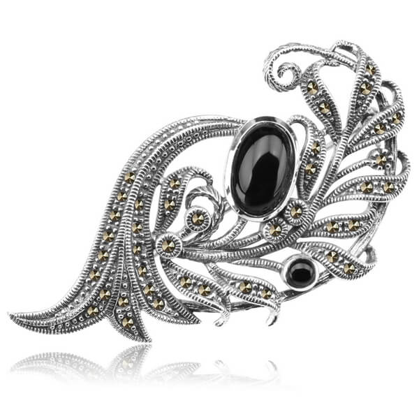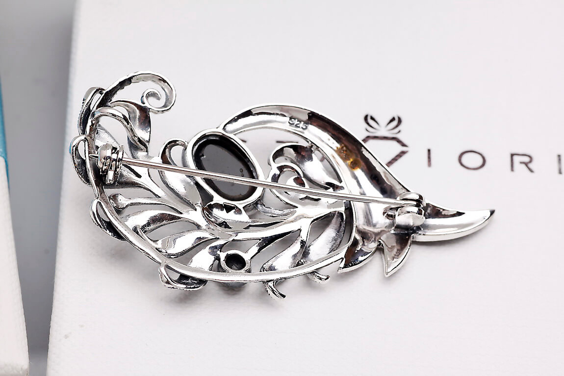 Wyjątkowa broszka w kształcie stylizowanego pióra, wykonana z rodowanego srebra próby 0,925. Jej misterny wzór ozdobiono lśniącymi markazytami, które podkreślają każdy detal. Centralnym akcentem są eleganckie onyksy, dodające całości głębi i tajemniczego charakteru. Broszkę można nosić także jako wisiorek, co czyni ją uniwersalnym dodatkiem do wielu stylizacji.