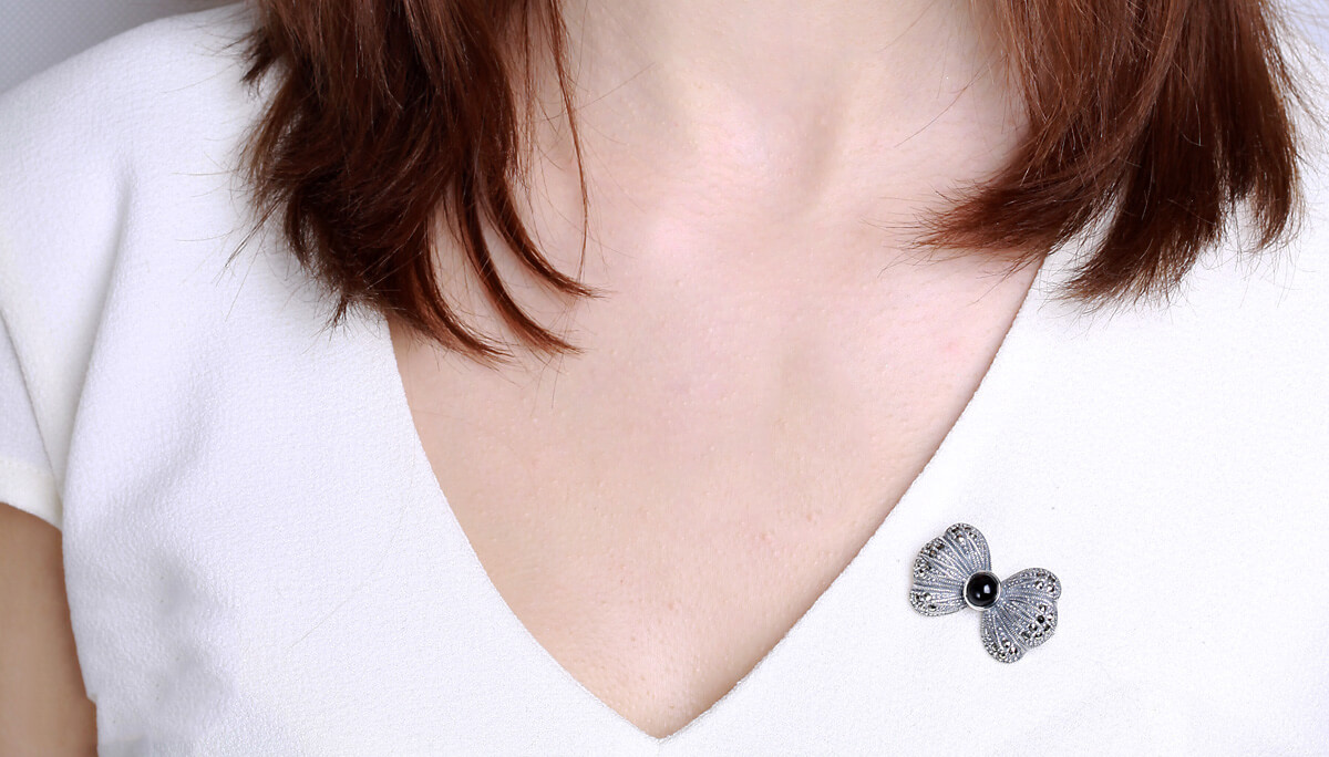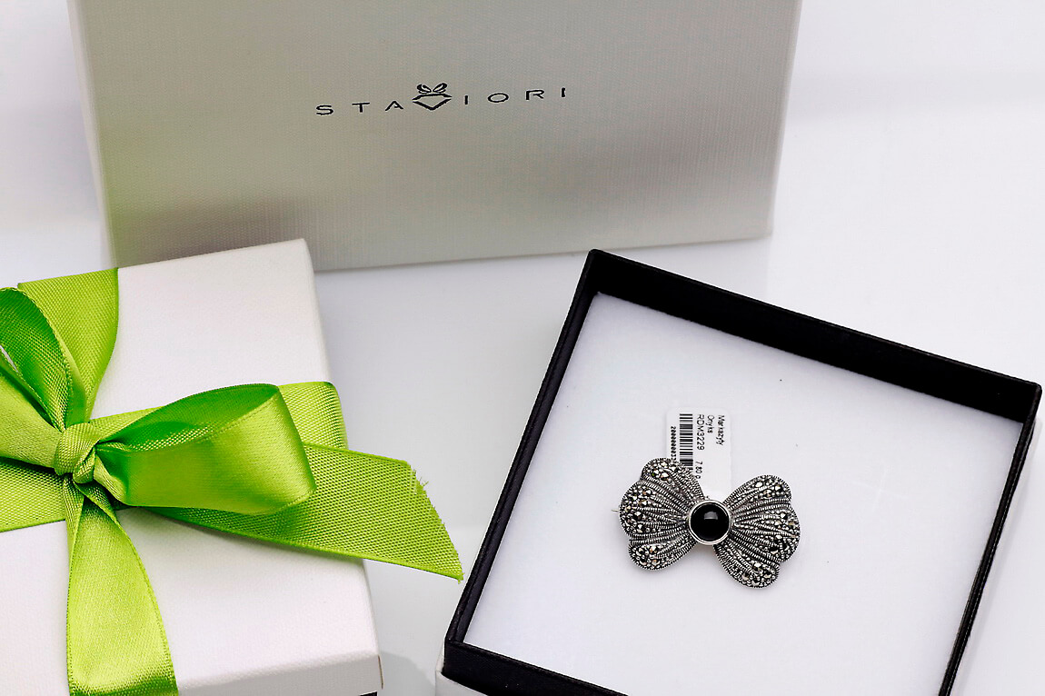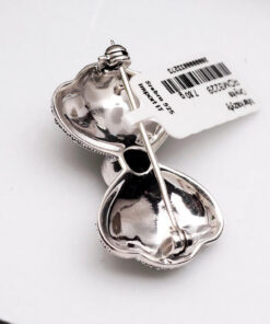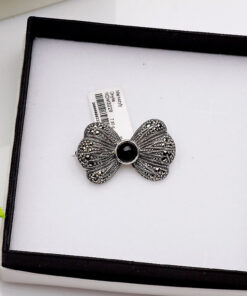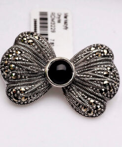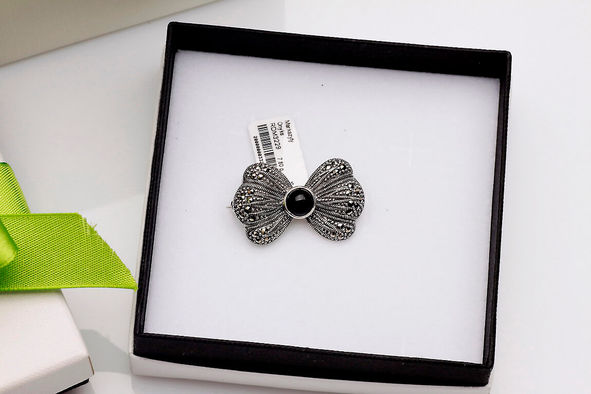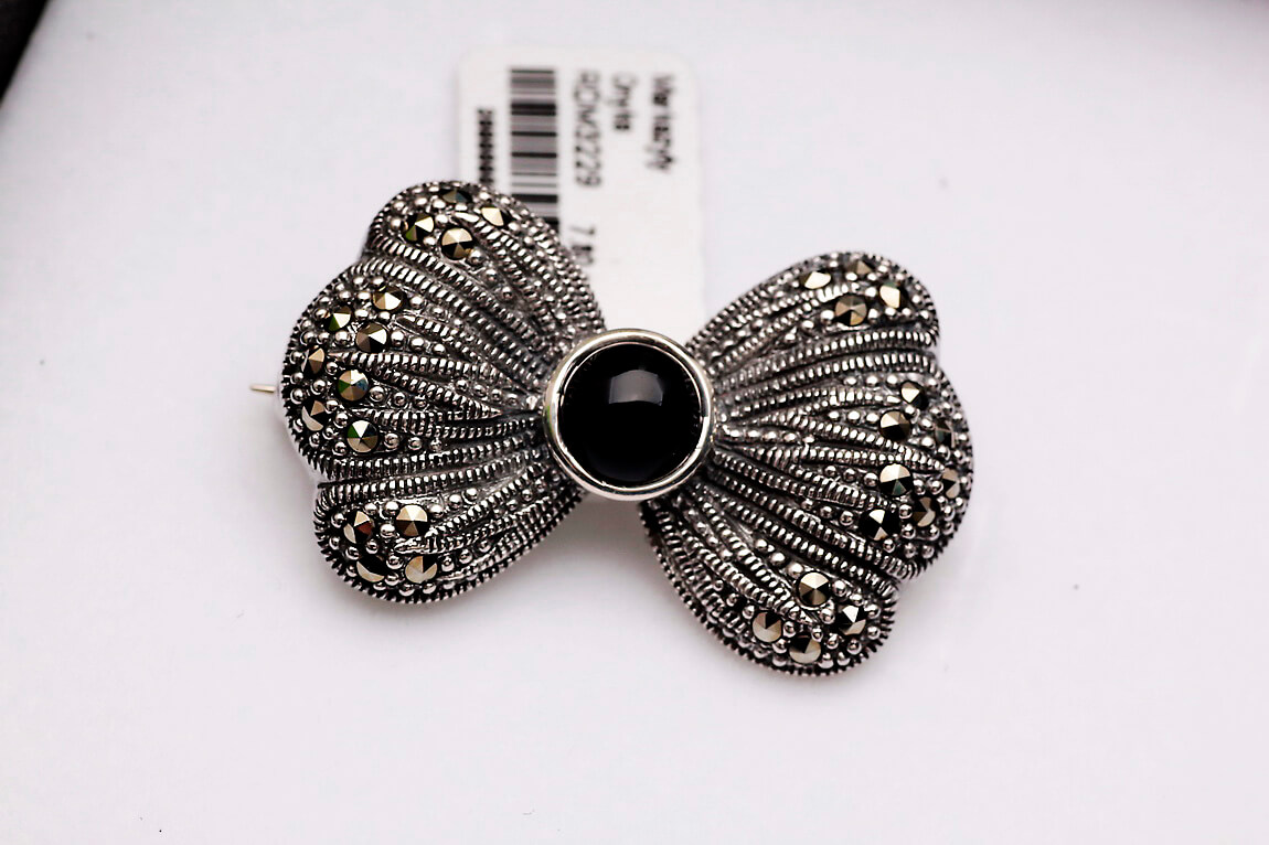 Subtelna broszka w kształcie kokardy, wykonana z rodowanego srebra próby 0,925. Jej powierzchnię zdobią lśniące markazyty, które nadają całości elegancji i blasku. Centralnym punktem jest głęboki, czarny onyks, który pięknie kontrastuje ze srebrem, podkreślając wyjątkowy charakter biżuterii. To stylowy dodatek, który doskonale sprawdzi się zarówno w codziennych, jak i wieczorowych stylizacjach.