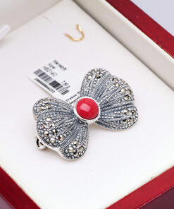Urocza broszka w kształcie kokardy, wykonana z rodowanego srebra próby 0,925. Jej powierzchnię zdobią połyskujące markazyty, które dodają całości eleganckiego blasku. Centralnym punktem kompozycji jest czerwony koral syntetyczny, nadający broszce wyjątkowego charakteru i wyrazistości. To idealny dodatek dla kobiet lubiących biżuterię o klasycznym, a zarazem odważnym stylu.