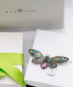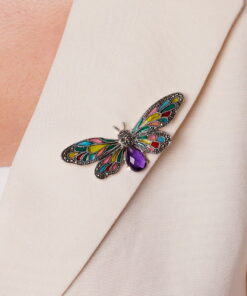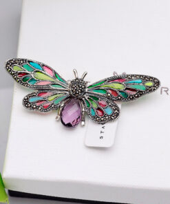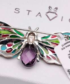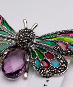 Oryginalna broszka w kształcie motyla wykonana ze srebra próby 0,925. Barwna emalia w połączeniu z połyskującymi markazytami tworzy efekt niezwykle elegancki i przyciągający wzrok. Centralnym punktem ozdoby jest intensywnie fioletowy kamień, który dodaje całości szlachetności i wyjątkowego charakteru. Idealny wybór dla kobiet ceniących unikalną biżuterię z artystycznym akcentem.