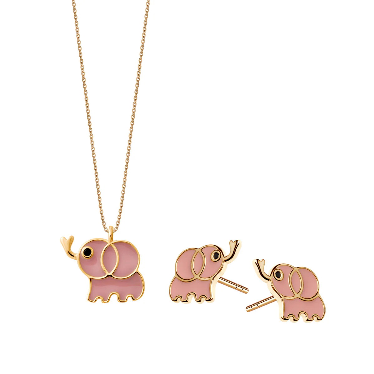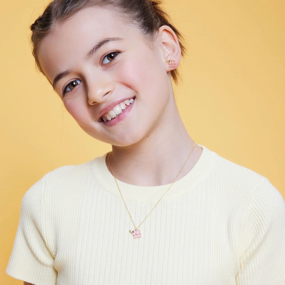 Uroczy komplet biżuterii dziecięcej wykonany ze srebra próby 0,925 pokrytego żółtym złotem. W skład zestawu wchodzi naszyjnik z regulowaną długością 40–45 cm oraz kolczyki na sztyft. Motywem przewodnim są słoniki z uniesioną trąbą – symbole szczęścia i radości, ozdobione różową oraz czarną emalią. To wyjątkowa propozycja dla najmłodszych, która łączy w sobie delikatność, zabawny design i pozytywną energię.