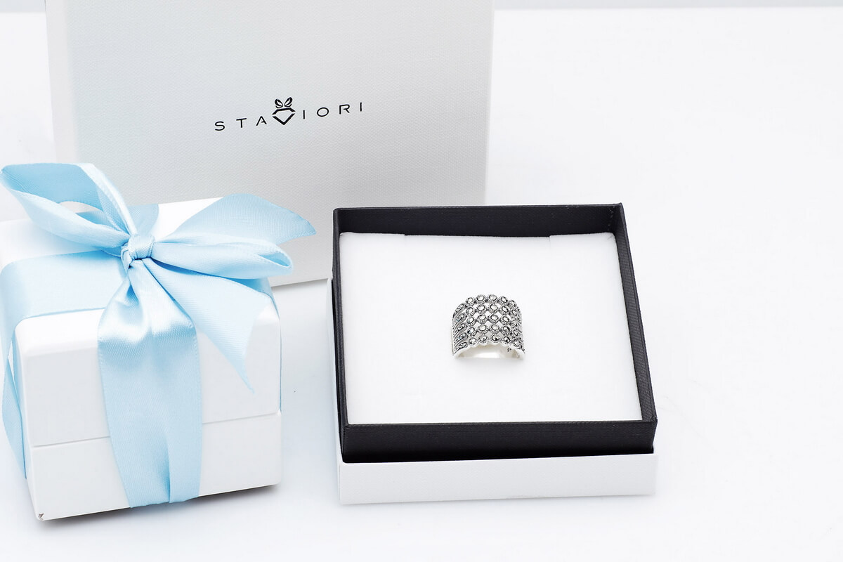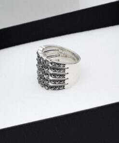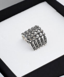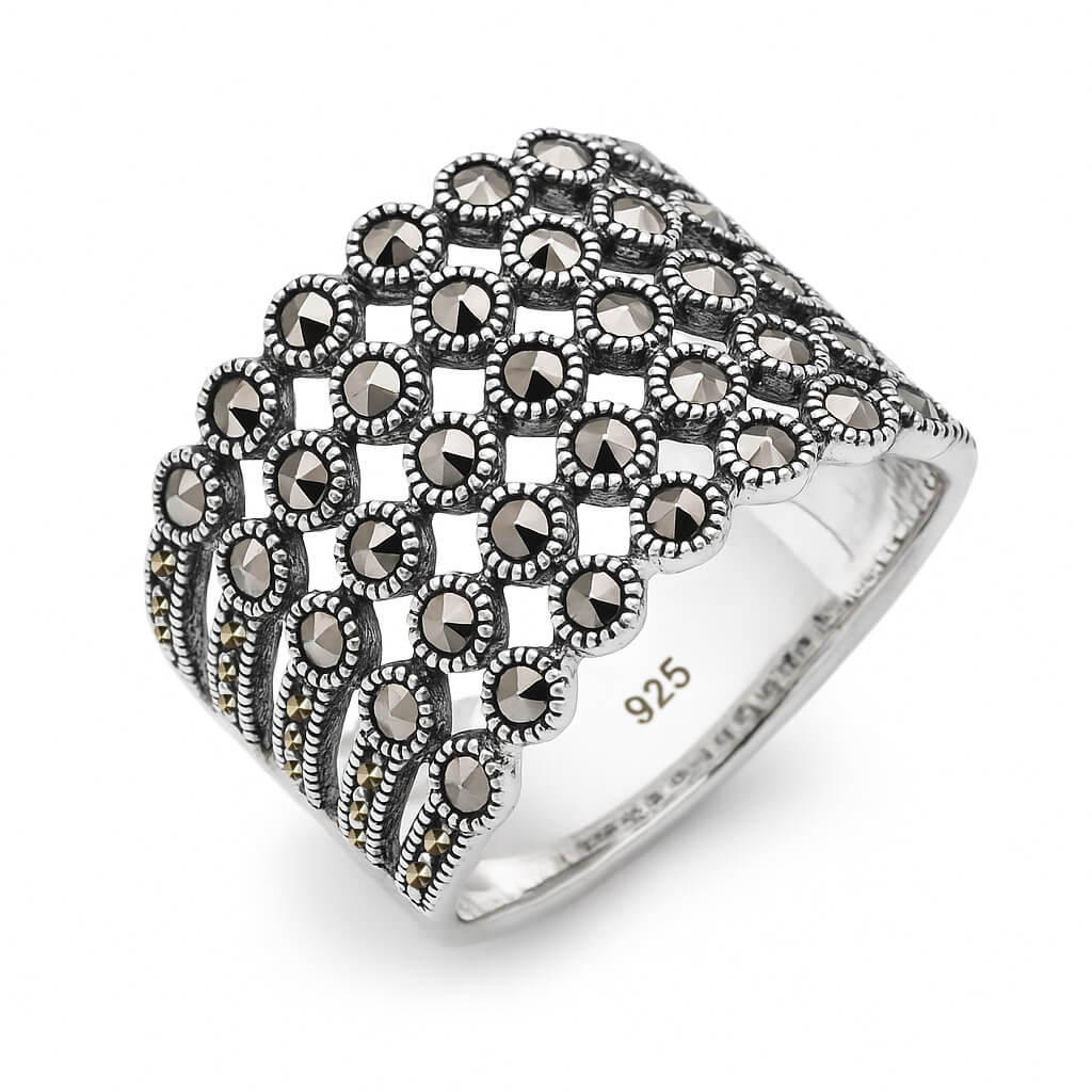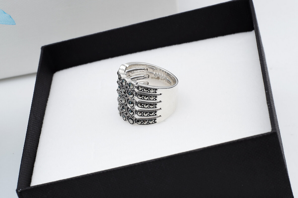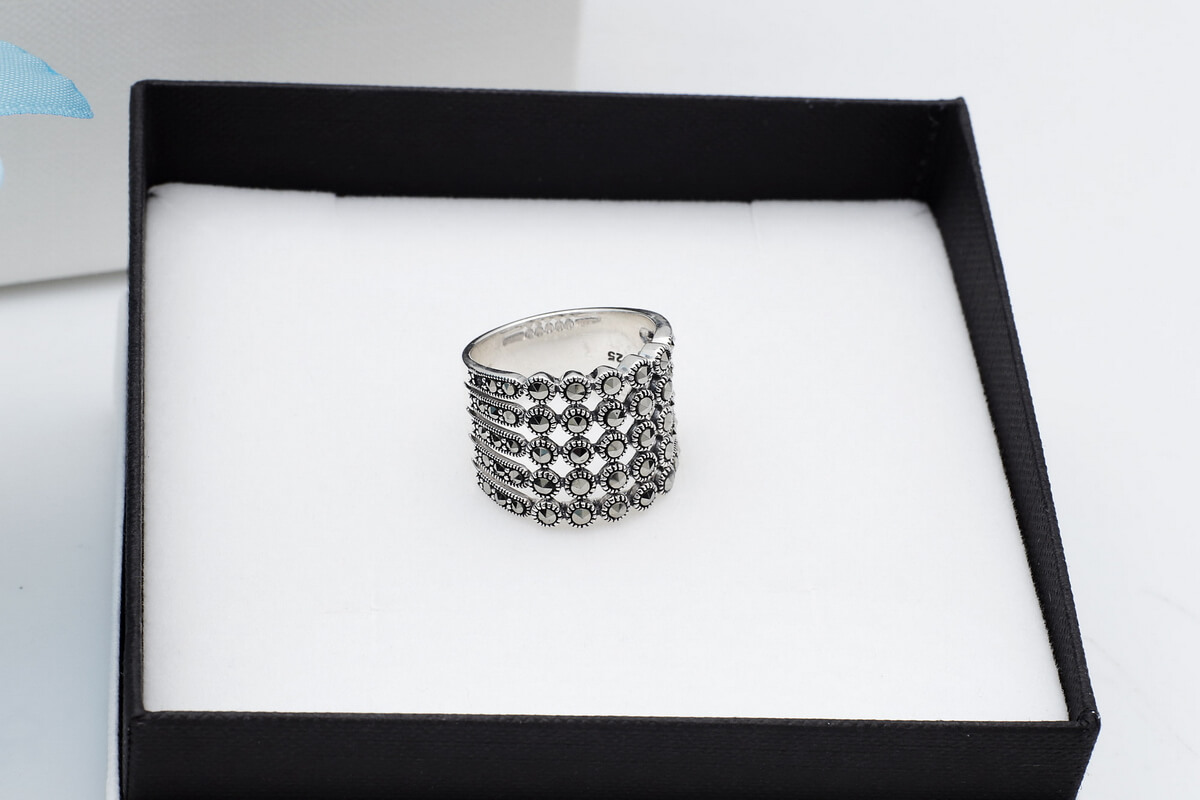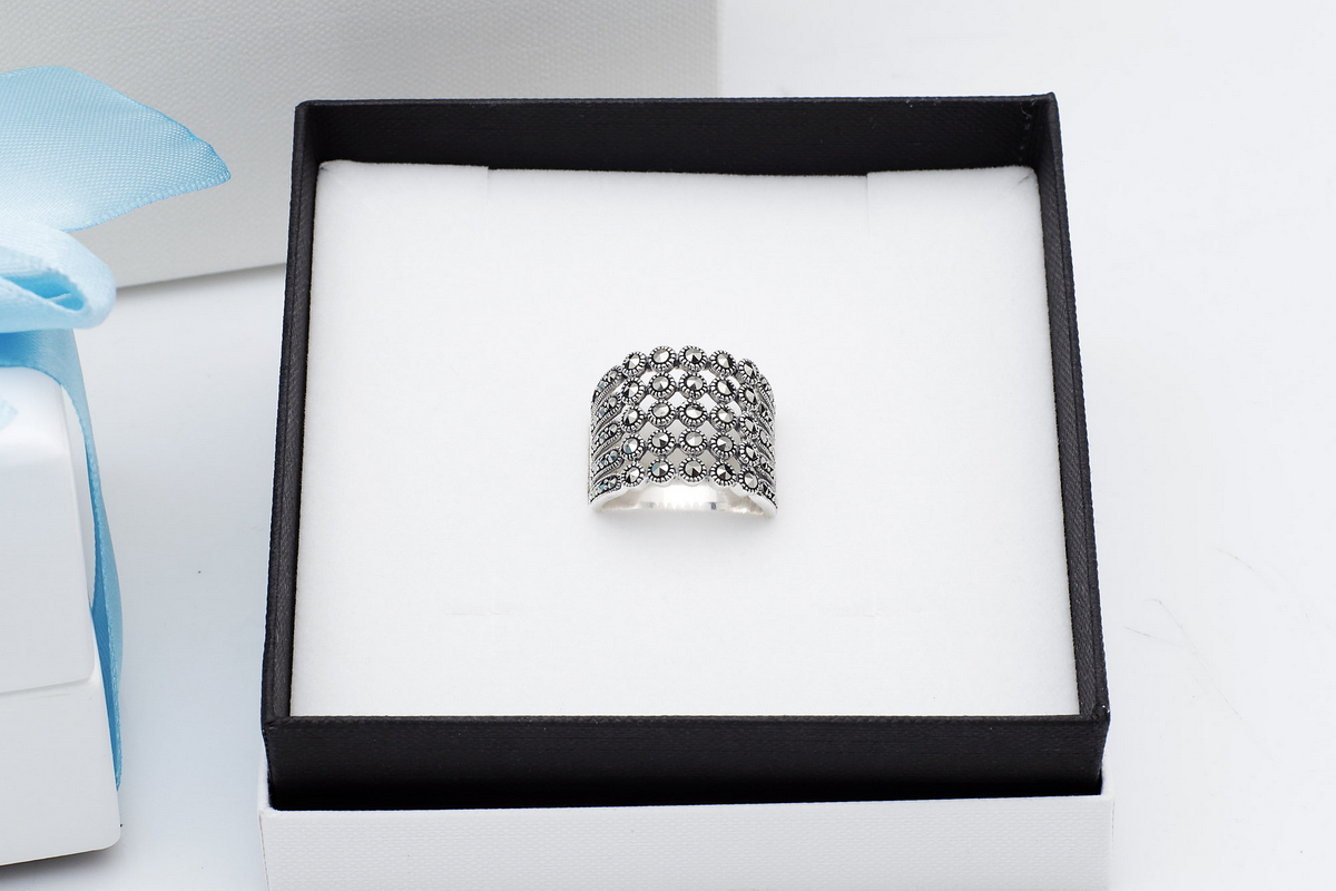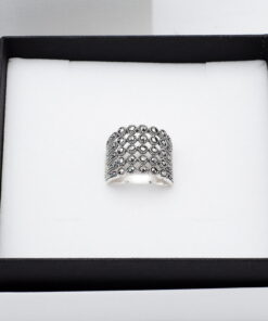 Zachwycający srebrny pierścionek z markazytami, który przyciąga wzrok swoim szerokim, koronkowym wzorem. Wykonany z najwyższej jakości srebra próby 0,925, zdobiony licznymi, lśniącymi kamieniami, tworzy elegancki i romantyczny efekt. Ażurowa konstrukcja i symetryczny układ sprawiają, że pierścionek prezentuje się lekko, a jednocześnie niezwykle efektownie. Idealny wybór dla kobiet ceniących oryginalną biżuterię w stylu vintage.