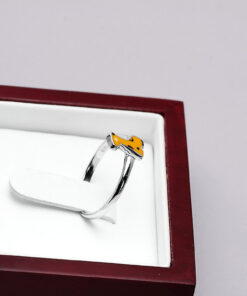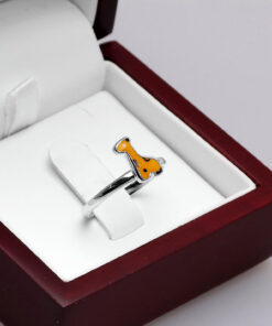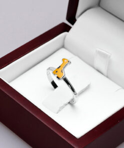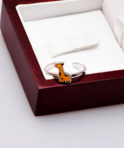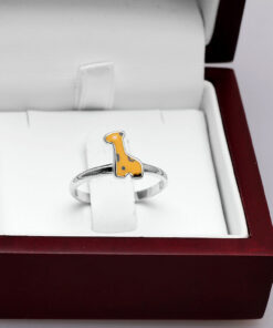 Uroczy srebrny pierścionek z motywem żyrafy, wykonany z najwyższej próby srebra 0,925 i pokryty barwną emalią. Otwarta forma pozwala na łatwą regulację rozmiaru, dzięki czemu doskonale dopasuje się do każdej dłoni. Idealny dodatek dla najmłodszych lub miłośniczek biżuterii z nutą dziecięcej radości i koloru.