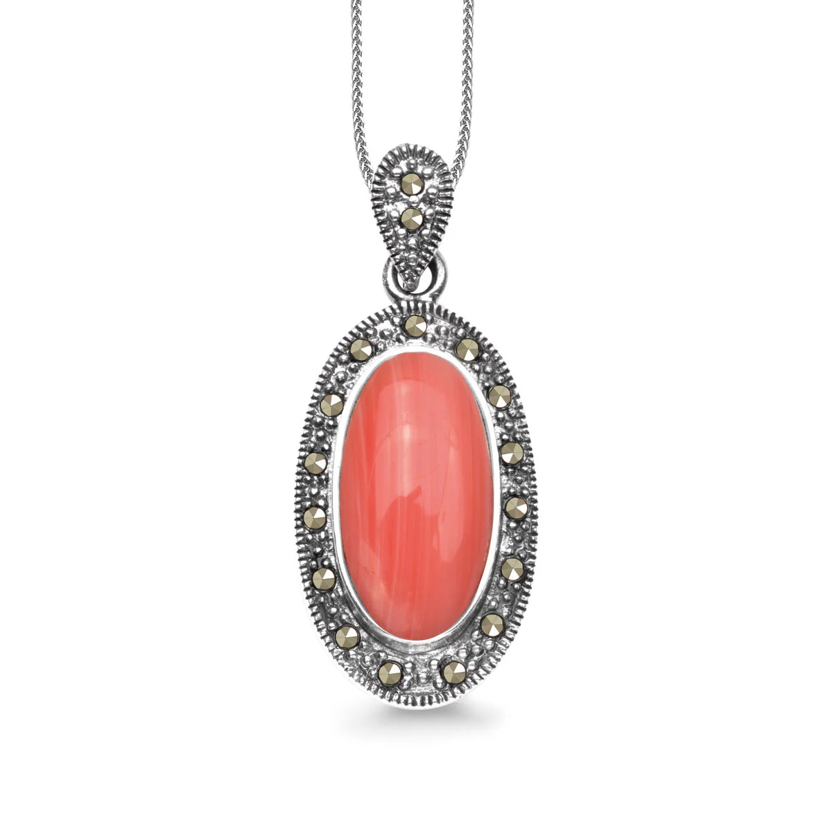 Zjawiskowy wisiorek Staviori wykonany z rodowanego srebra próby 0,925 zachwyca połączeniem intensywnego koralu i błyszczących markazytów. Owalny kamień o ciepłej, głębokiej barwie przyciąga wzrok, a misternie zdobiona oprawa nadaje całości elegancji w stylu vintage. To biżuteria, która doda charakteru każdej stylizacji i podkreśli indywidualny gust właścicielki.