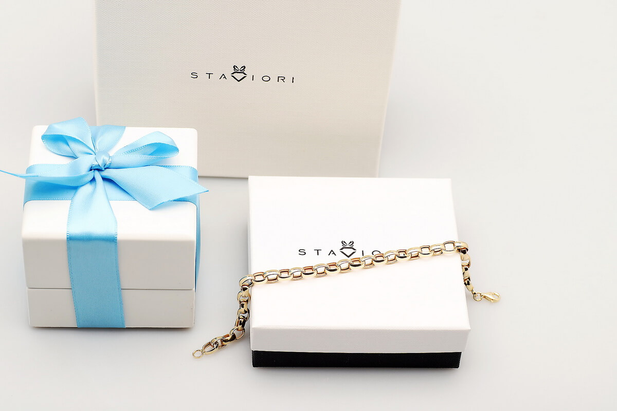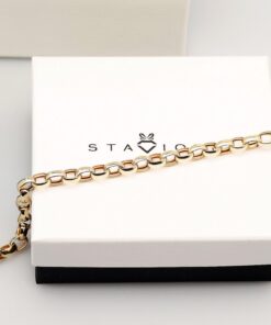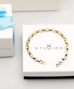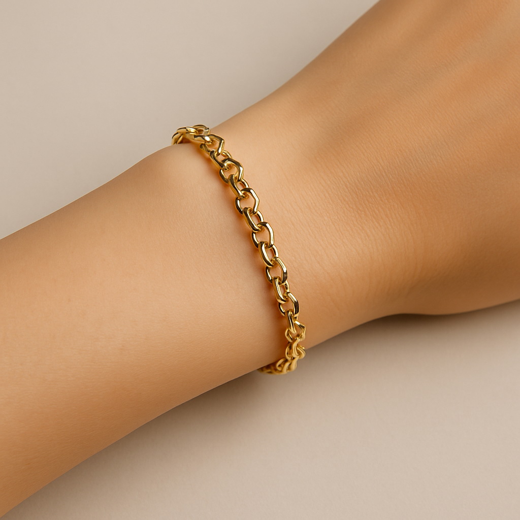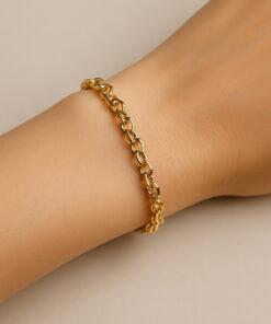 Elegancka bransoleta z 14-karatowego żółtego złota o klasycznym splocie typu ROLO. Jej mocne, okrągłe ogniwa pięknie odbijają światło, tworząc efekt luksusu i ponadczasowej elegancji. Doskonale prezentuje się zarówno solo, jak i z ulubionymi charmsami. Idealna dla kobiet ceniących wyrazistą biżuterię i możliwość personalizacji. Splot ROLO jest unisex – doskonale nada się również dla mężczyzn.