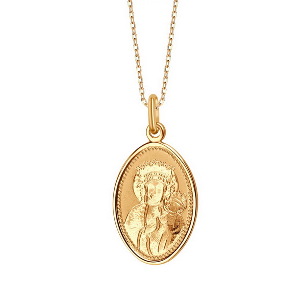 Elegancki medalik owalny z wizerunkiem Matki Boskiej Częstochowskiej, wykonany z żółtego złota próby 0,333. Starannie odwzorowane detale oraz subtelnie zdobiona krawędź nadają mu wyjątkowego charakteru. To piękny symbol wiary, tradycji i duchowej opieki – doskonały jako pamiątka ważnych uroczystości religijnych.