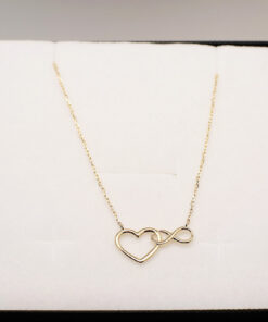 Delikatny naszyjnik wykonany z żółtego złota próby 0,333, ozdobiony motywem serca splecionego z symbolem nieskończoności. To wyjątkowa biżuteria, która symbolizuje wieczną miłość, oddanie i nierozerwalną więź. Prosta forma i subtelny połysk złota sprawiają, że naszyjnik jest idealnym dodatkiem zarówno do codziennych, jak i bardziej eleganckich stylizacji. Regulowana długość łańcuszka pozwala dopasować go do własnych preferencji. Perfekcyjny wybór na prezent dla ukochanej osoby.