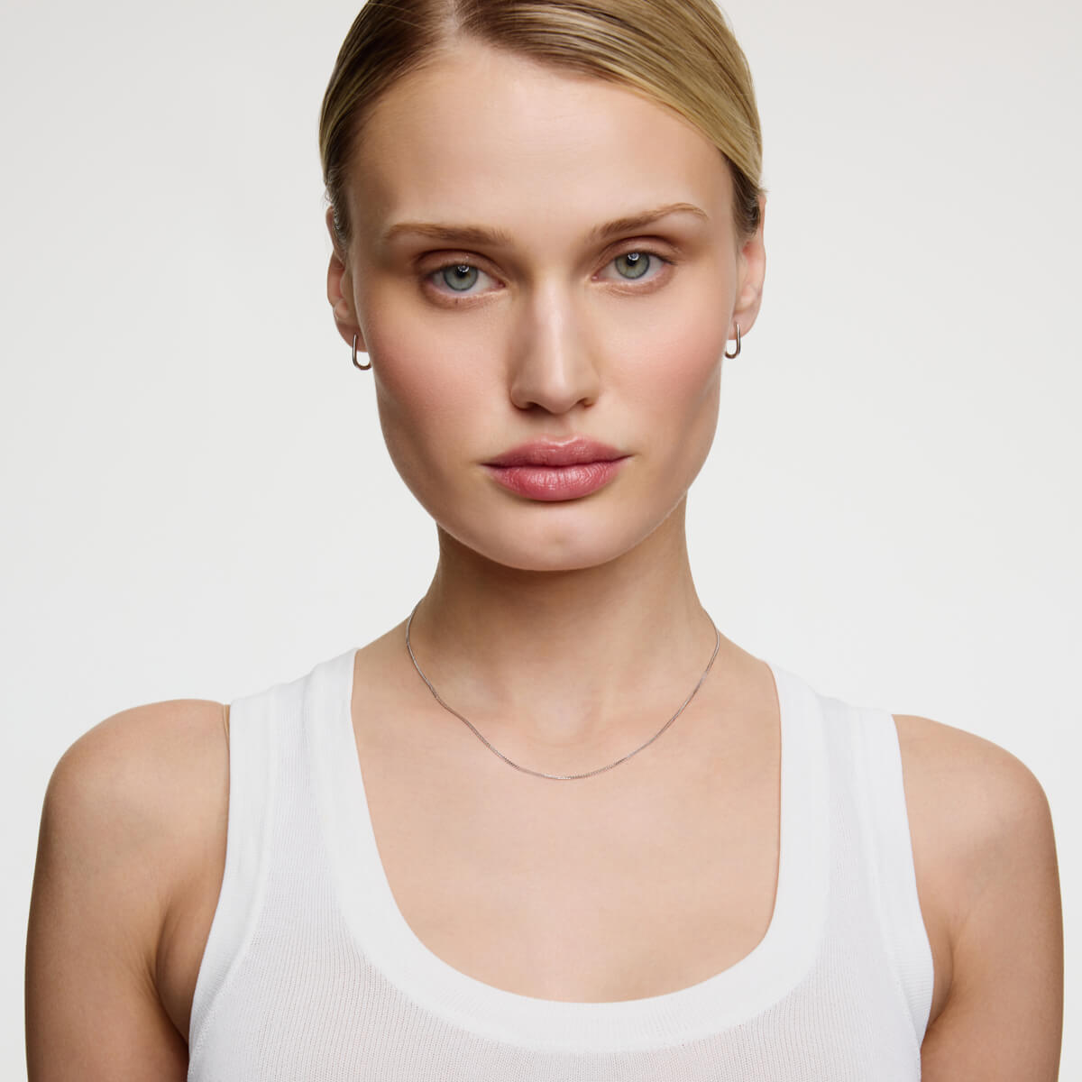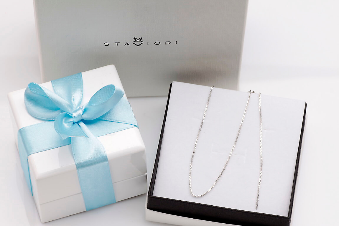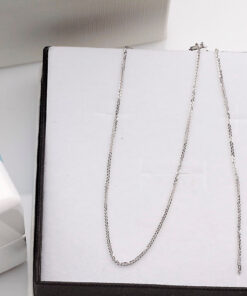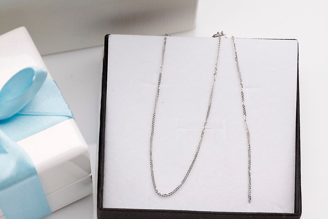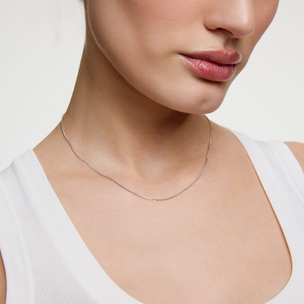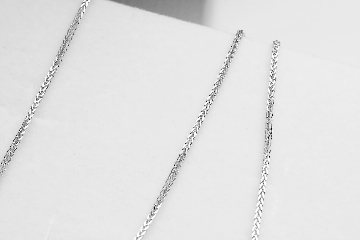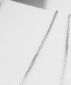 Subtelny łańcuszek Spiga o długości 42cm lub 50cm wykonany z 14-karatowego białego złota. Precyzyjnie pleciony splot o szerokości 0,8 mm delikatnie się mieni, tworząc minimalistyczny, a zarazem elegancki dodatek. Lekka konstrukcja zapewnia komfort noszenia przez cały dzień, idealnie sprawdzając się solo lub z ulubionym wisiorkiem.