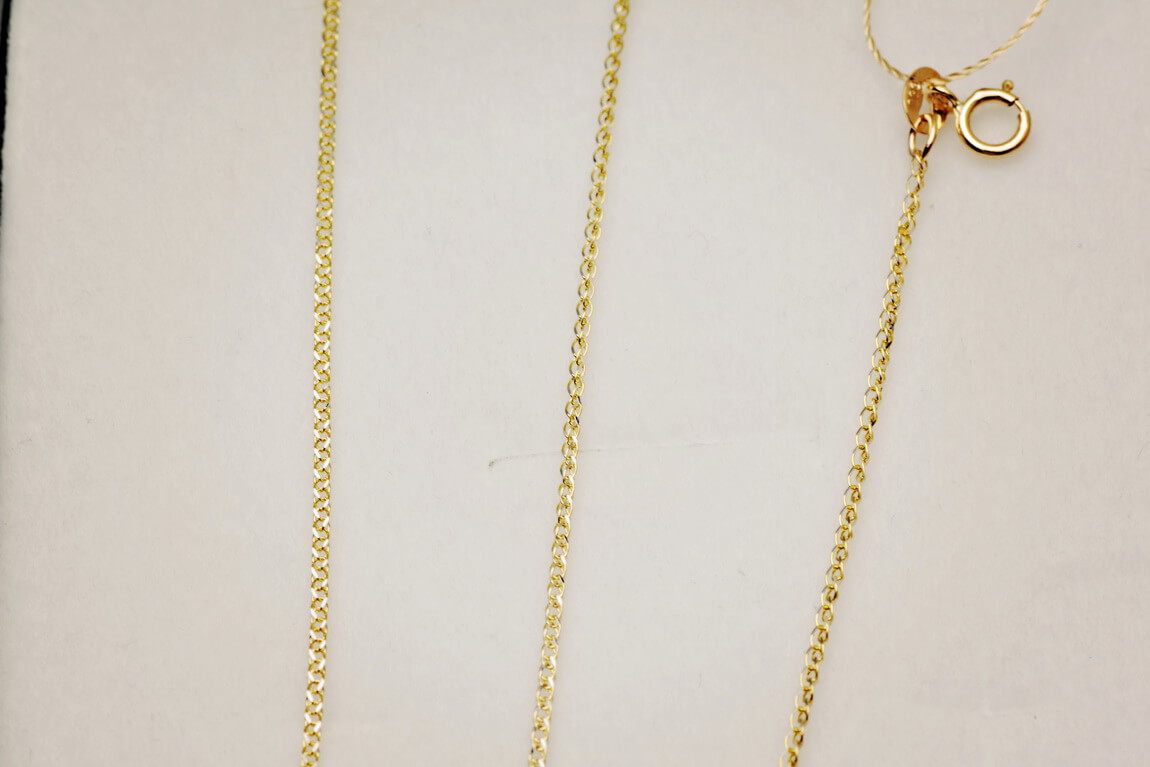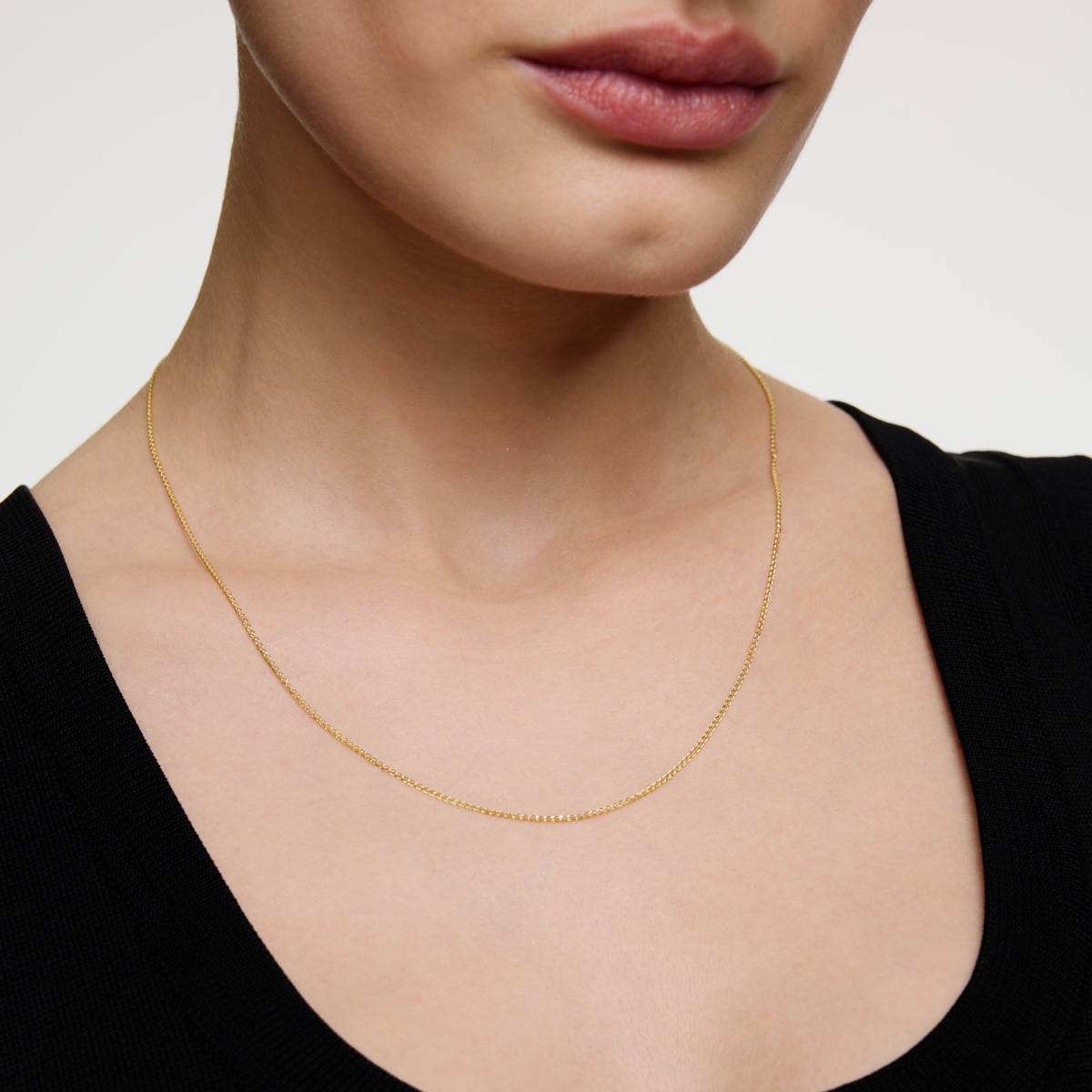 Delikatny łańcuszek z żółtego złota próby 0,585 o klasycznym splocie, który subtelnie podkreśla szyję. Starannie wypolerowane ogniwa pięknie odbijają światło, nadając całości eleganckiego blasku. To idealna baza pod drobny wisiorek lub minimalistyczny akcent noszony solo. Biżuteria, która zachwyca prostotą i ponadczasowym urokiem.