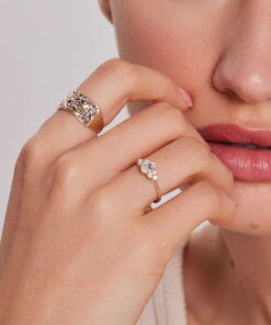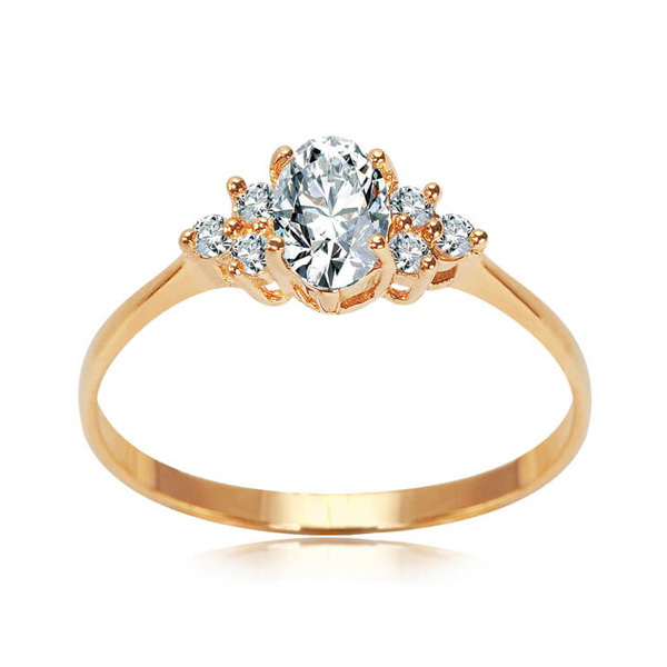 Subtelny pierścionek z żółtego złota próby 0,333 ozdobiony lśniącą cyrkonią w kształcie owalnym. Dodatkowe, mniejsze kamienie po bokach dodają mu wyjątkowego blasku i finezji. To delikatna, kobieca biżuteria, idealna na prezent lub jako symbol wyjątkowych uczuć. Klasyczna elegancja w lekkiej, romantycznej formie.
