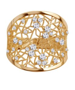 Zjawiskowy pierścionek z żółtego złota o ażurowym wykończeniu i niezwykle ozdobnym charakterze. Finezyjna koronka z metalu została usiana lśniącymi cyrkoniami, które pięknie odbijają światło i dodają całości biżuteryjnego blasku. To model, który z pewnością przyciąga spojrzenia – idealny dla kobiet kochających wyraziste dodatki z klasą.