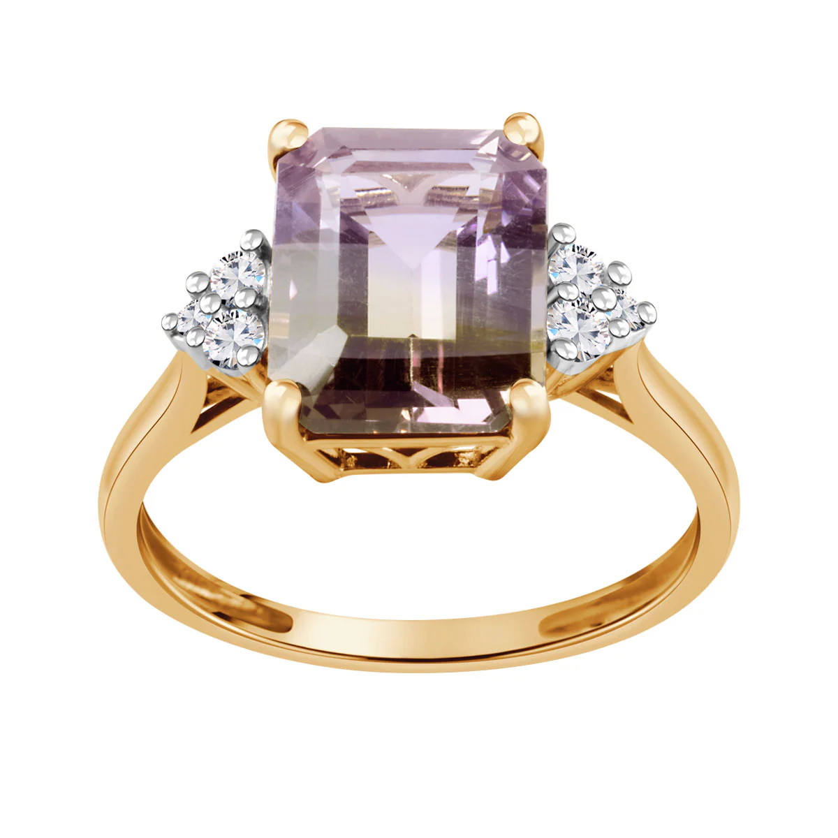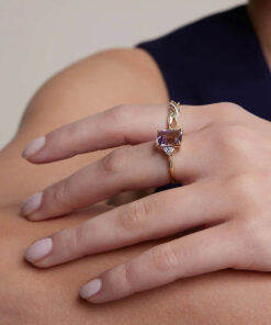 Zjawiskowy pierścionek z żółtego złota 14k, ozdobiony wyjątkowym ametrynem o masie 3,06 ct w szlifie prostokątnym. Unikalne połączenie fioletu i żółci w kamieniu tworzy fascynującą grę barw, dodatkowo podkreśloną blaskiem sześciu brylantów. To luksusowa biżuteria, która zachwyca elegancją i oryginalnym charakterem – idealna na specjalne okazje.