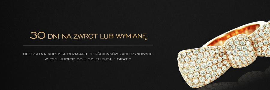 Uwaga! W przypadku pierścionków wykonywanych na indywidualne zamówienie nie ma możliwości wymiany rozmiaru pierścionka, a jedynie zmiana rozmiaru przez naszego wyspecjalizowanego złotnika. Jednakże tylko jeśli konstrukcja pierścionka pozwala na zmianę rozmiaru!