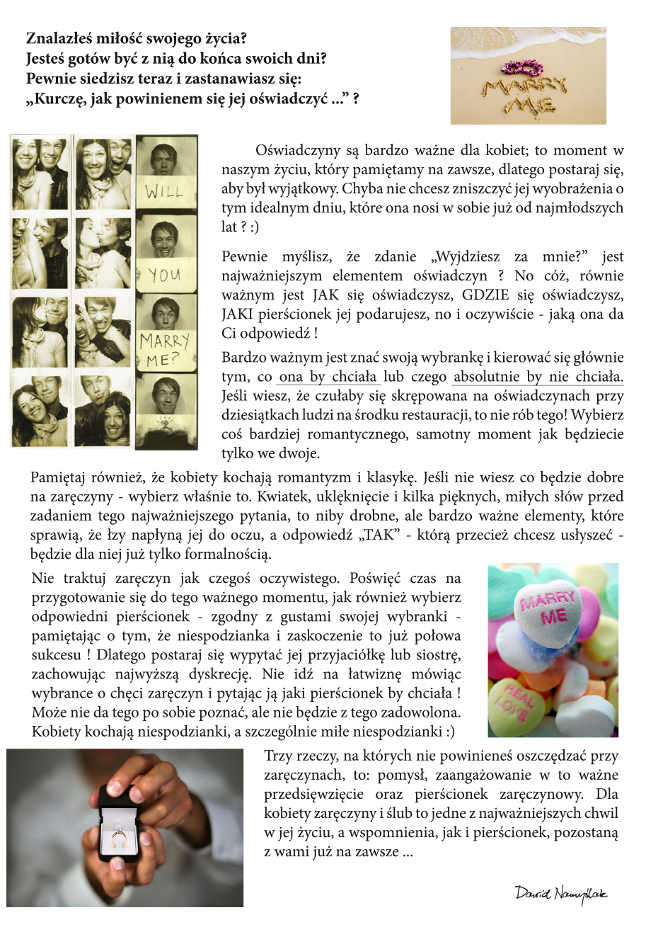 Idealnym pierścionkiem zaręczynowym jest jedno-kamieniowy pierścionek z diamentem o szlifie brylantowym. Klasyczny wzór takiego pierścionka to tzw. chaton, o prostej, czystej formie, z jednym kamieniem o dowolnej masie, osadzonym w delikatnym koszyczku.